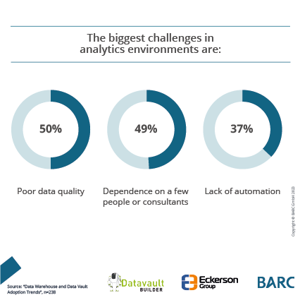 This survey report was executed by BARC and the Eckerson Group and examines data warehouse and data vault adoption trends in modern analytics environments, including architecture types, priorities, and automation. It recommends that companies double down on fundamentals such as data quality, adopt commercial automation tools, and learn more about the data vault. Best-in-class companies such as Datavault Builder set an example for others to follow.